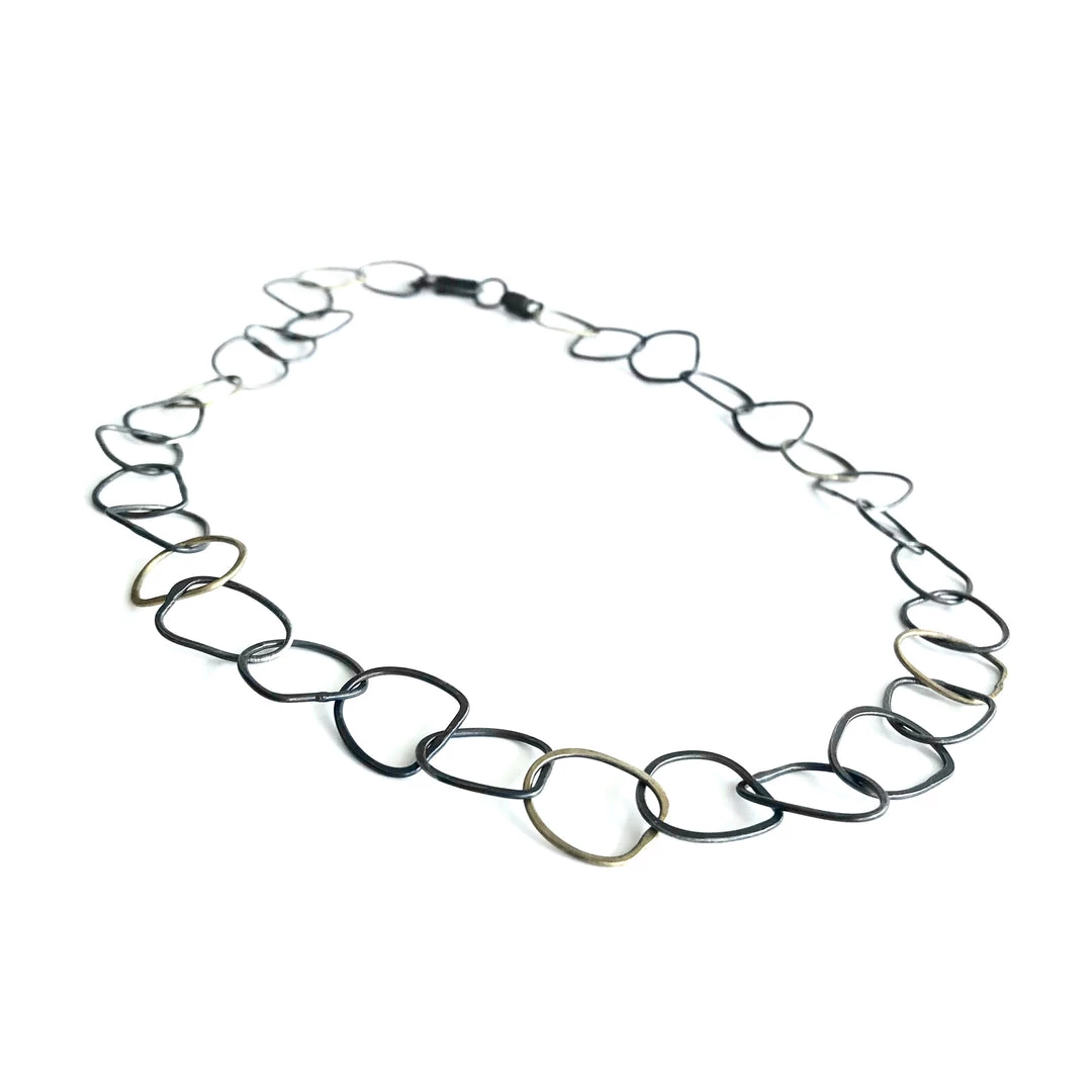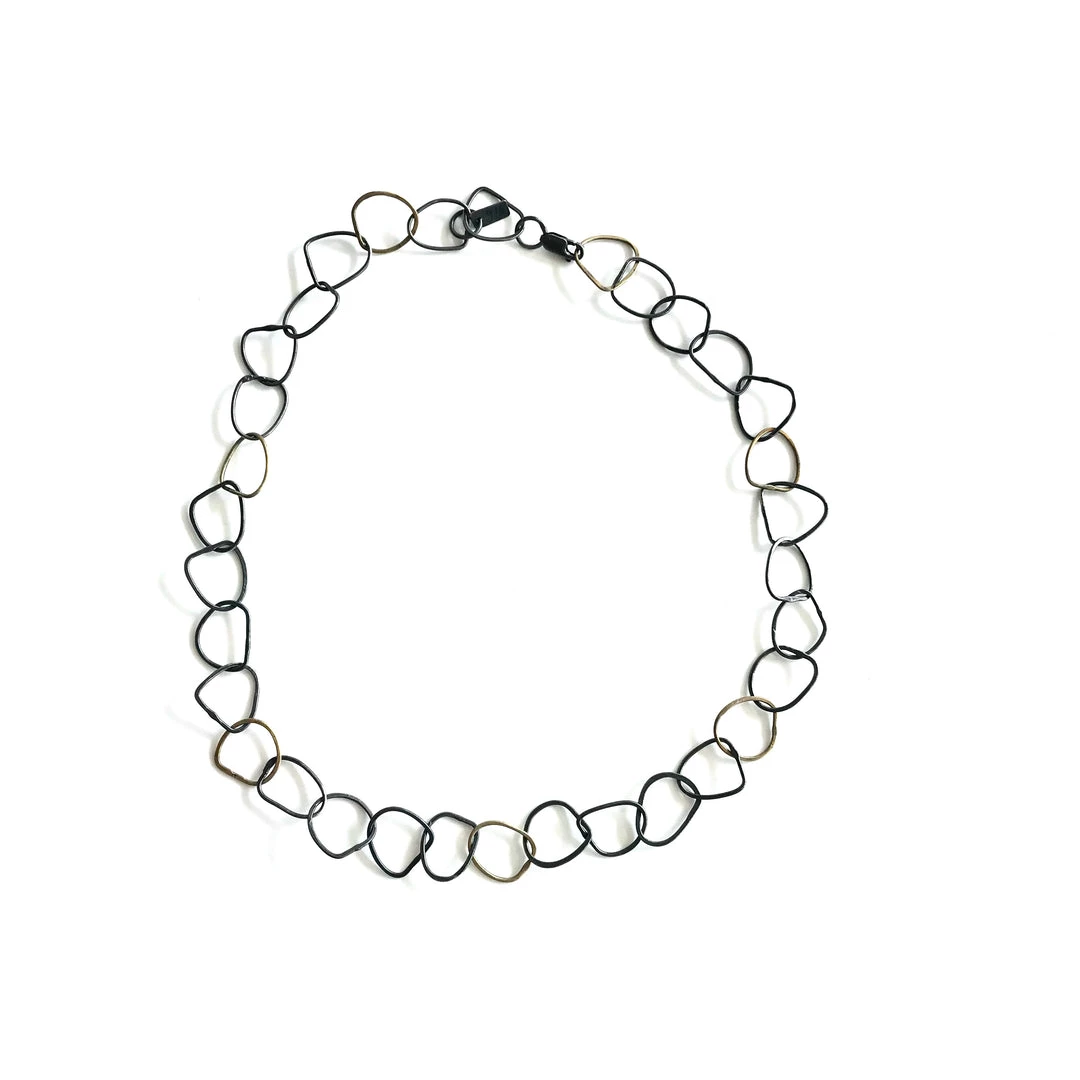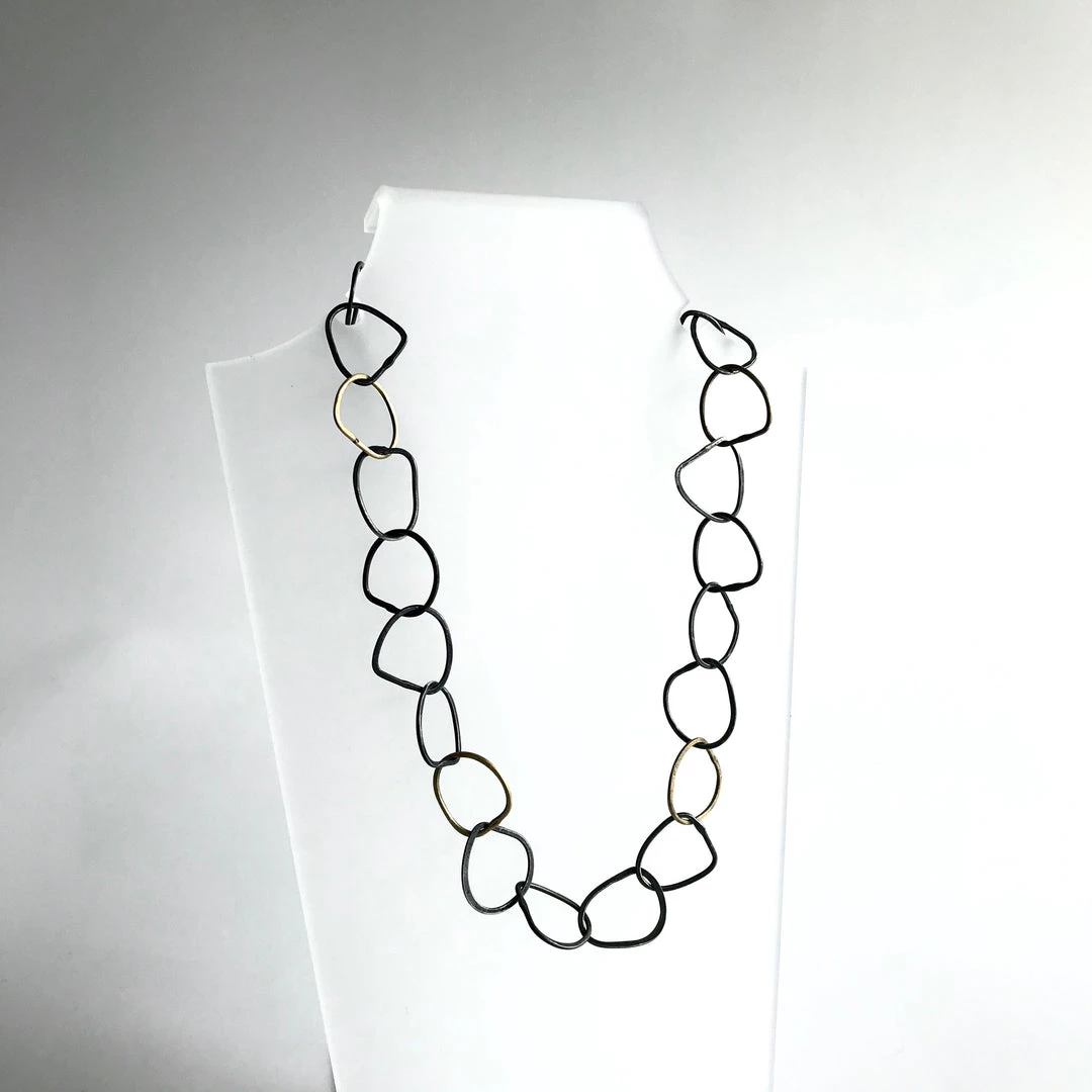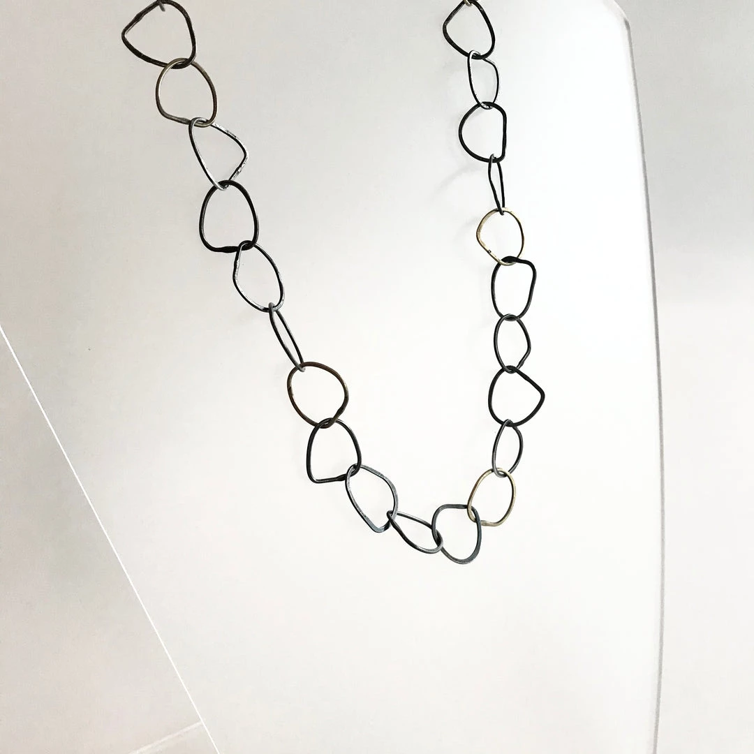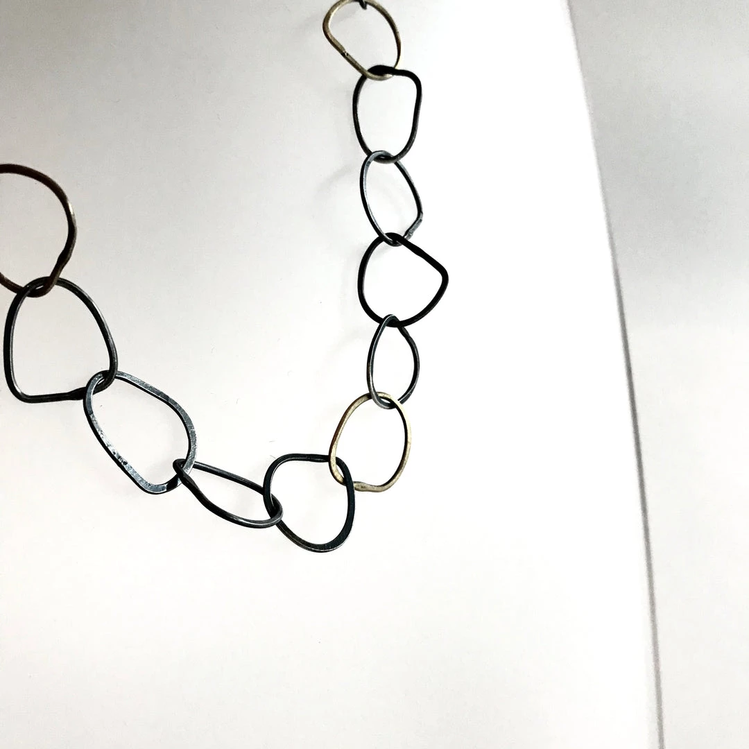 This stunning necklace is made up from a series of linked beaten and oxidised gold + silver hoops, each hand forged by the amazingly talented jeweller and print maker Karen Daye Hutchenson in her Belfast studio.Â