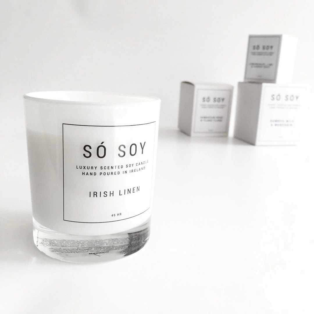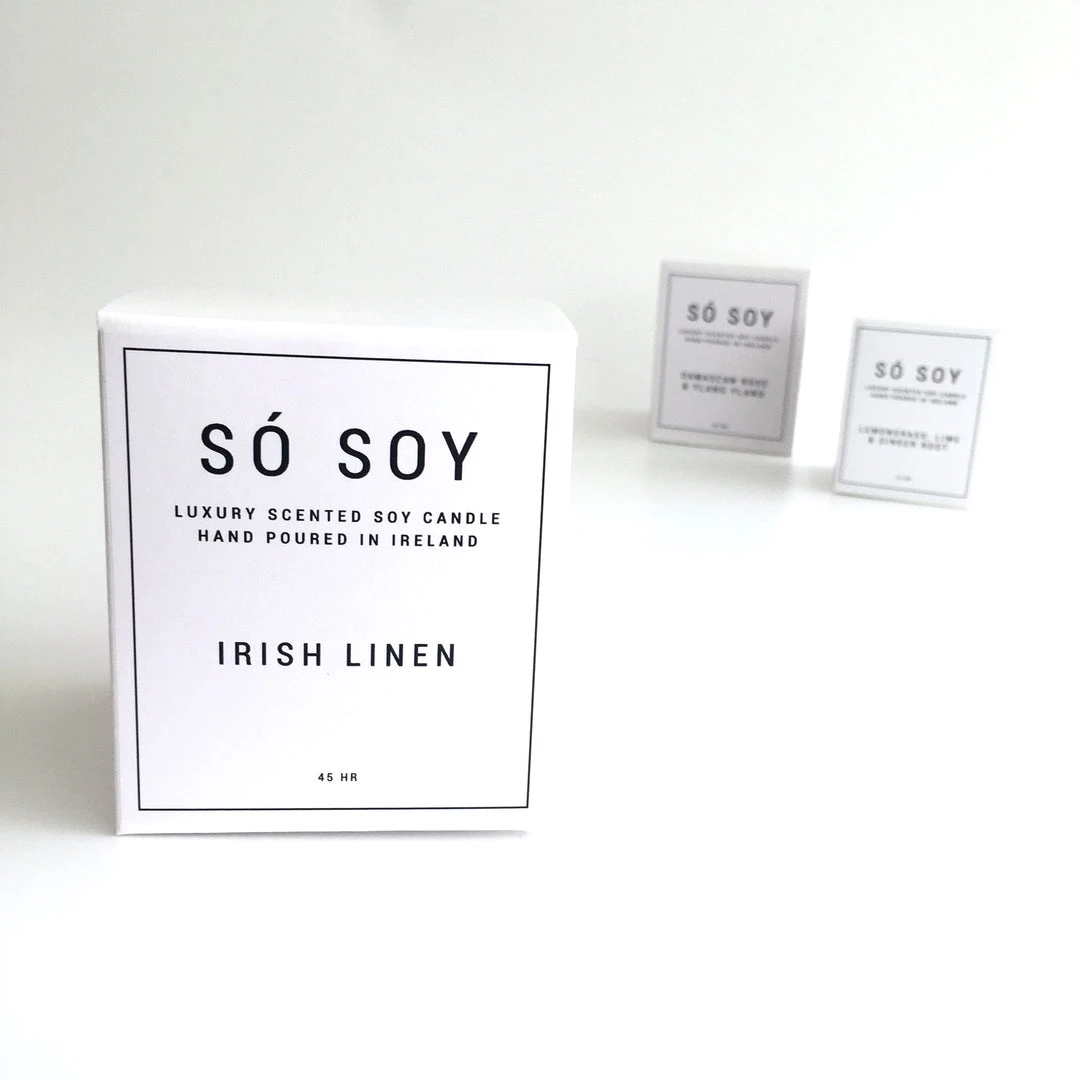 SÓ SOY hand pour each and every candle in their studio on the North coast of Ireland, using 100% natural soy wax and luxurious fragrance oils. Made from a blend of soya beans and botanical oils, SÓ SOY candles use wax from suppliers that are responsibly and ethically minded. Soy wax allows for a slower, sustainable burn that lasts longer than traditional petroleum based paraffin candles. Hannah works closely with a selection of UK based perfumers, using luxurious fragrance oils that are always vegan friendly.