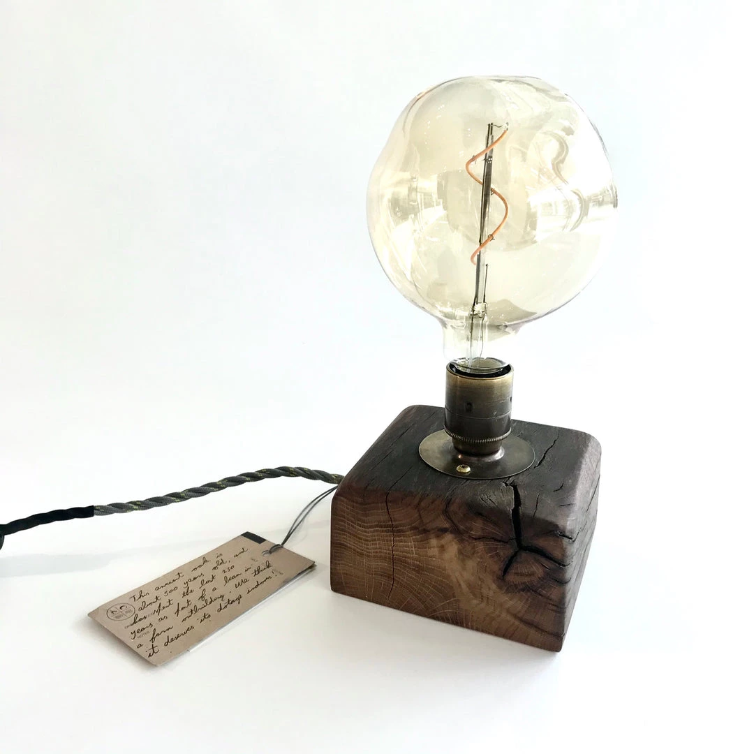 The Dromod table lamp comes in a variety of woods and storm-fallen Irish timbers ranging from spalted beech to salvaged oak beams. This particular lamp is made from roof beams from an old barn in the days when oak was plentiful enough to be used as beams in a barn!