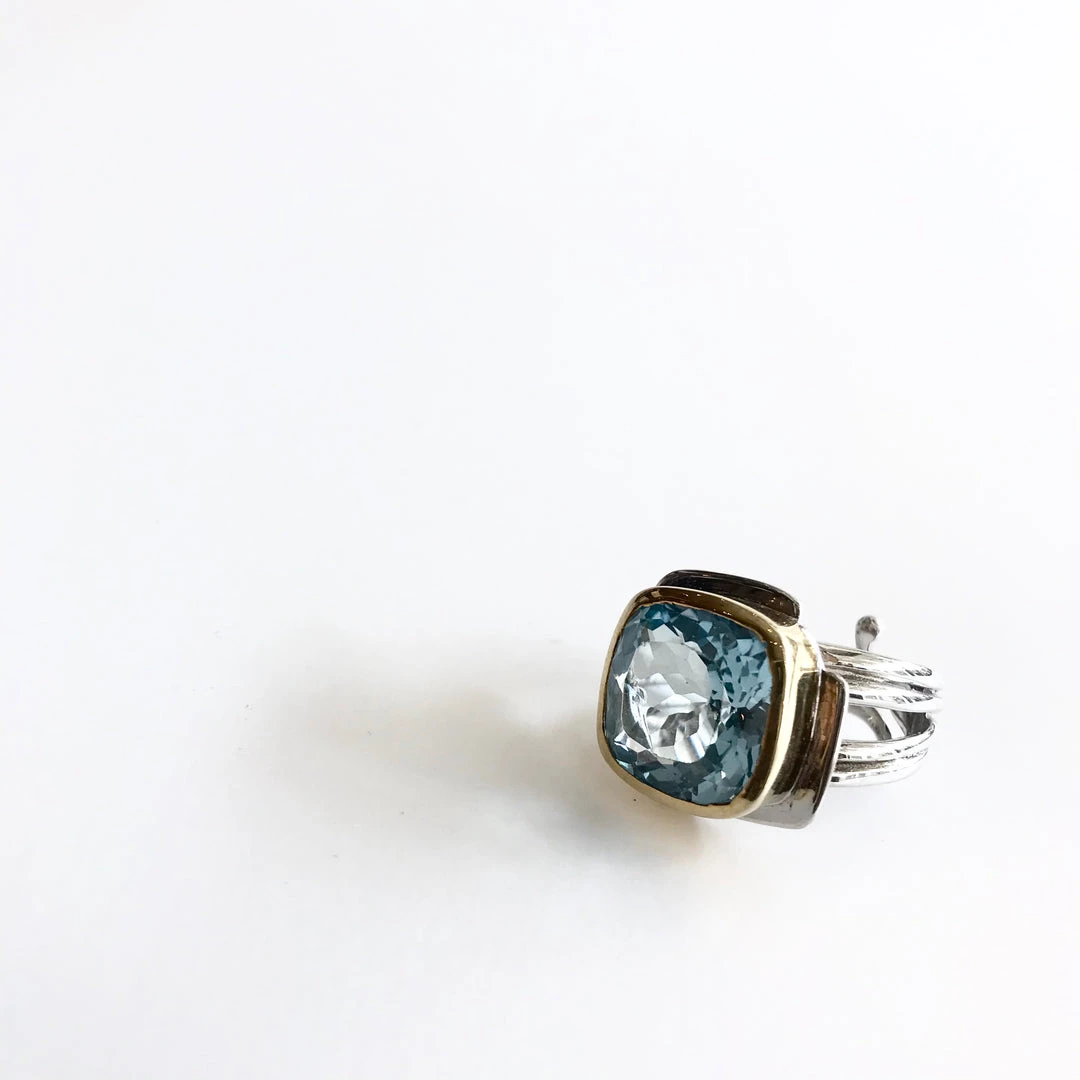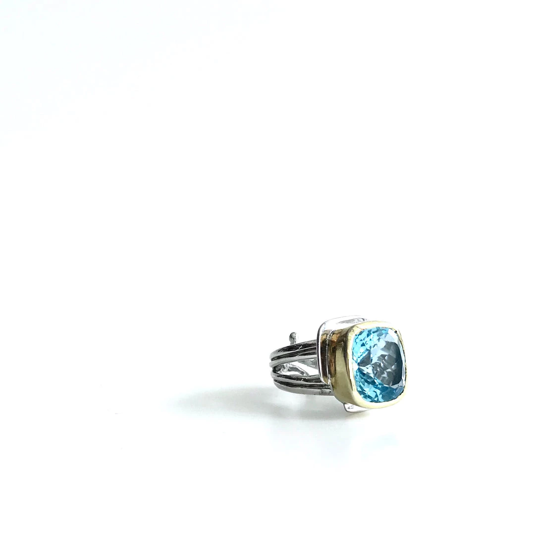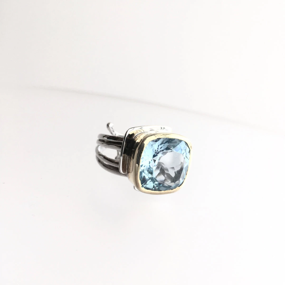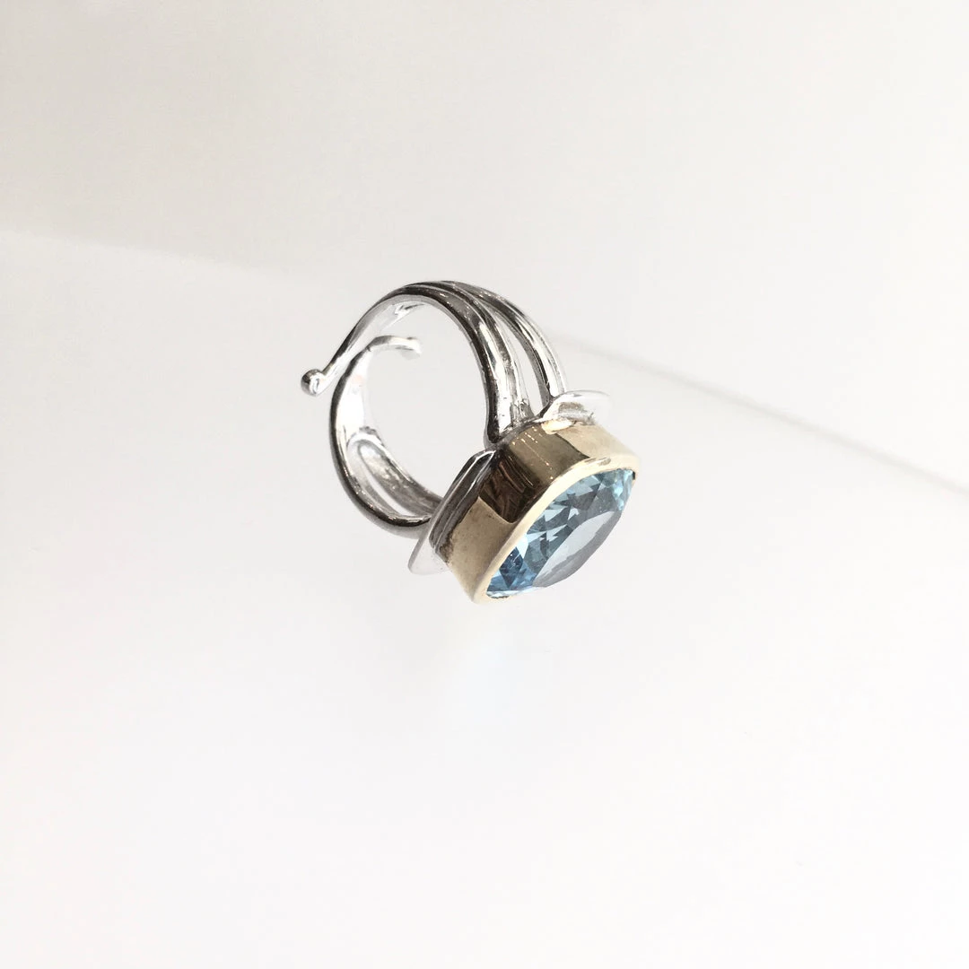 This Stunning rough cut Blue Topaz ring is set in a solid silver ring with gold plating. It is fully adjustable with beautiful soft finishing on the underside, so it’s the perfect fit!Â