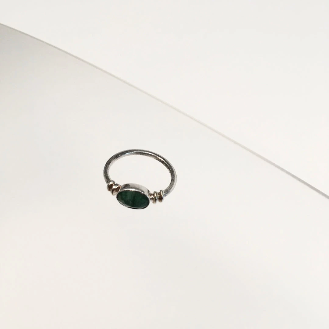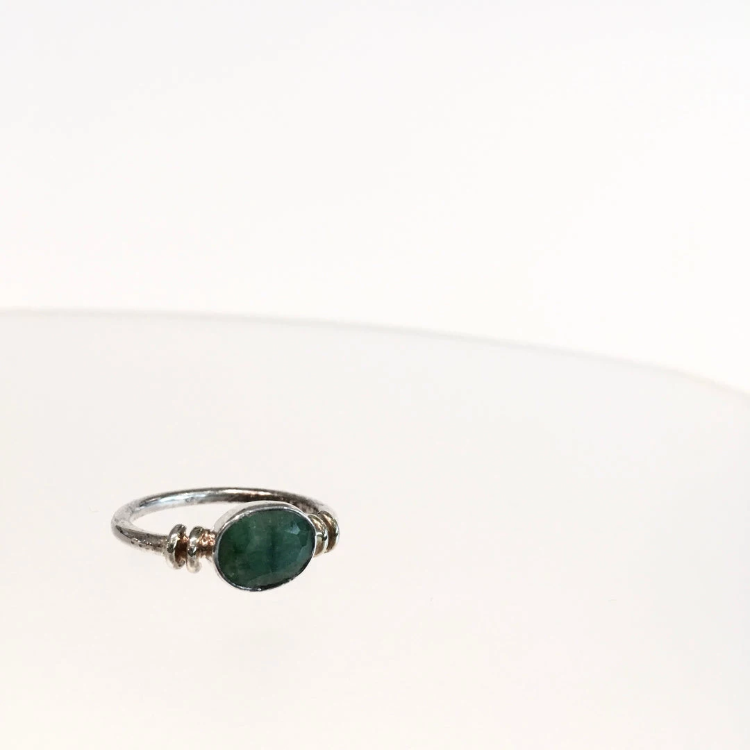 Emerald set in a solid silver ring with gold plating. It is fully adjustable with beautiful soft finishing on the underside, so it’s the perfect fit!Â
