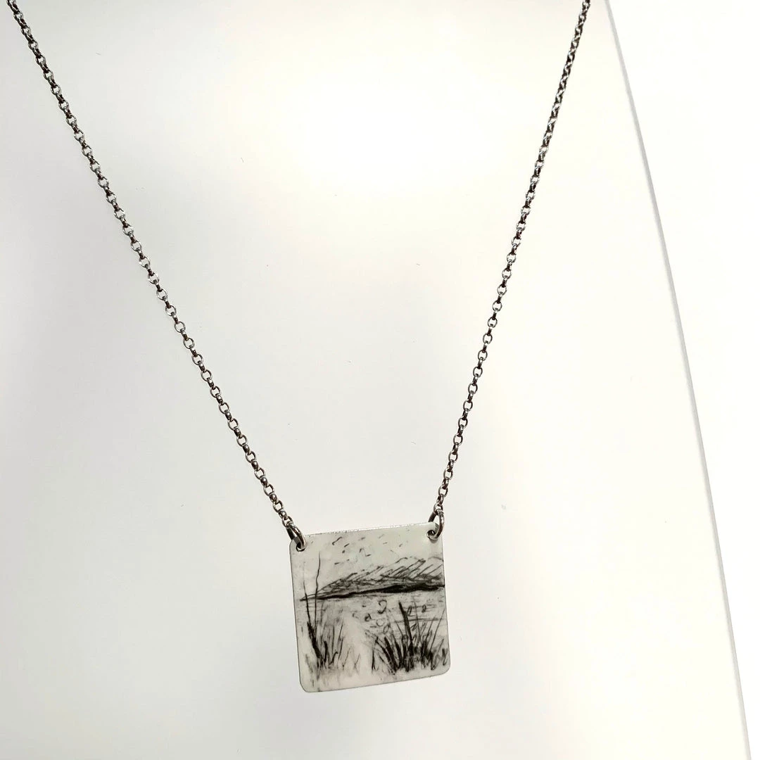 Stunning silver and enamel sketched half square pendant, made by the amazingly talented jeweller and print maker Karen Daye Hutchenson in her Belfast studio.Â
