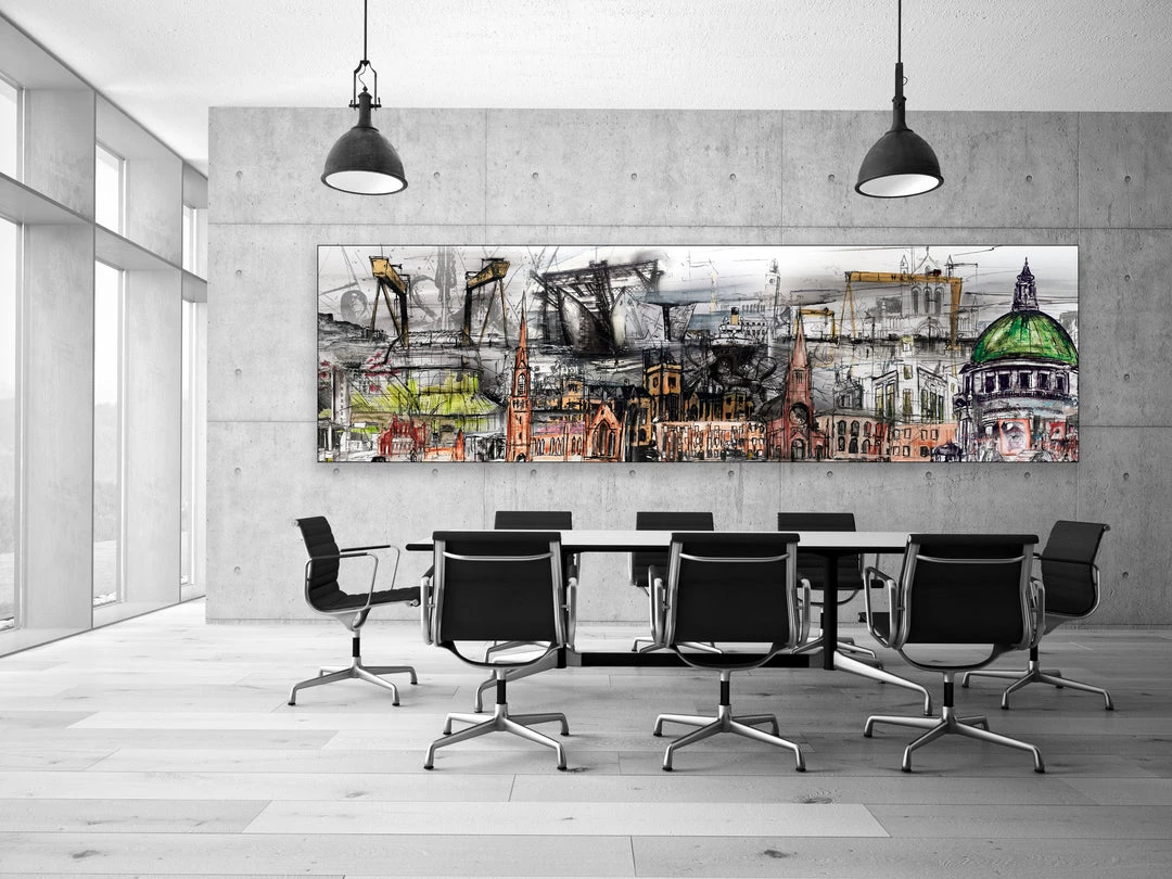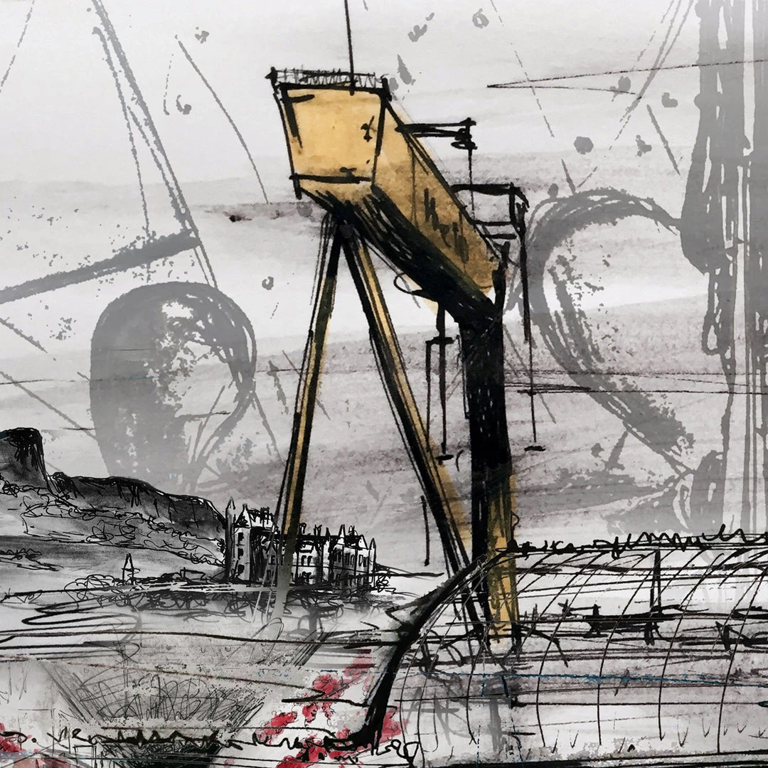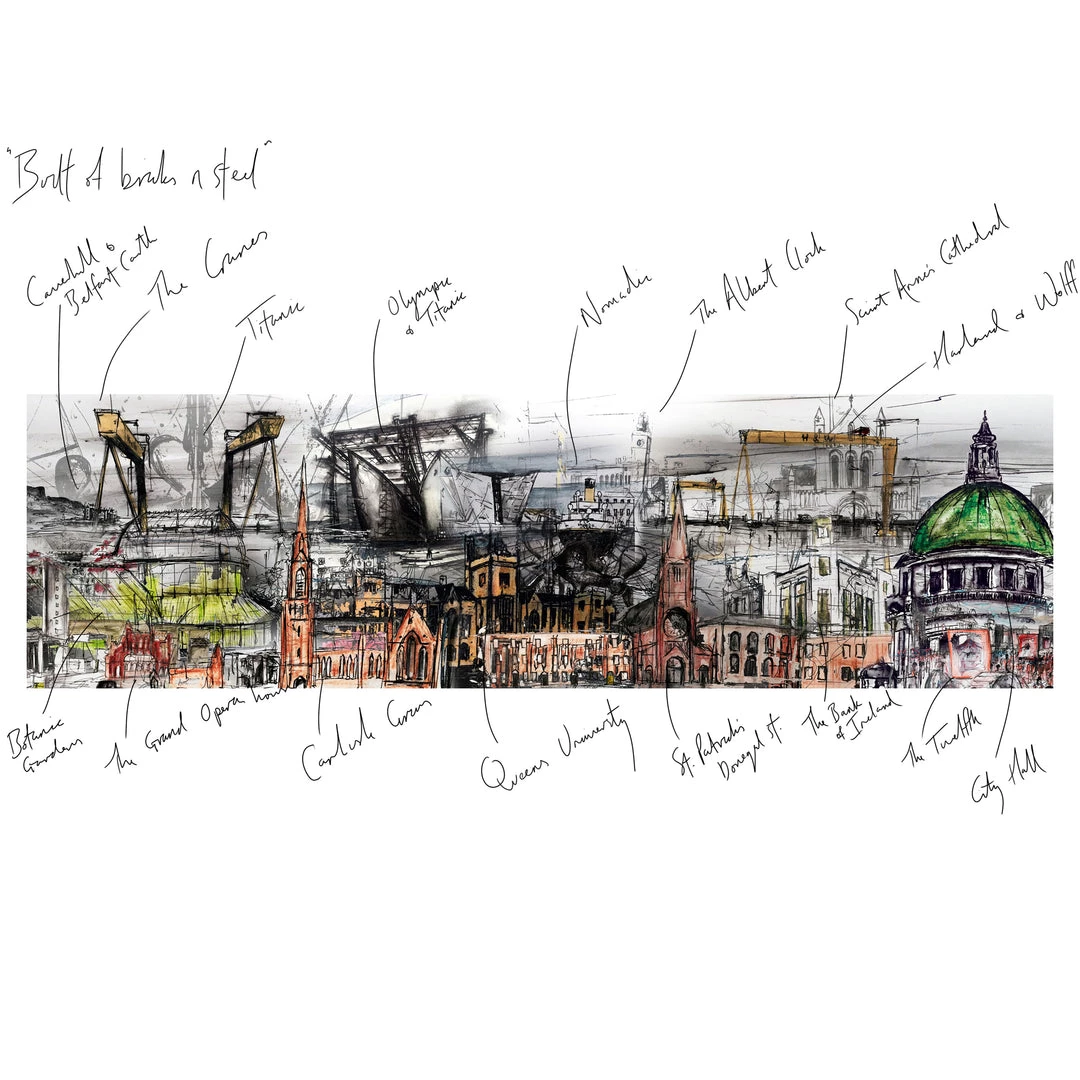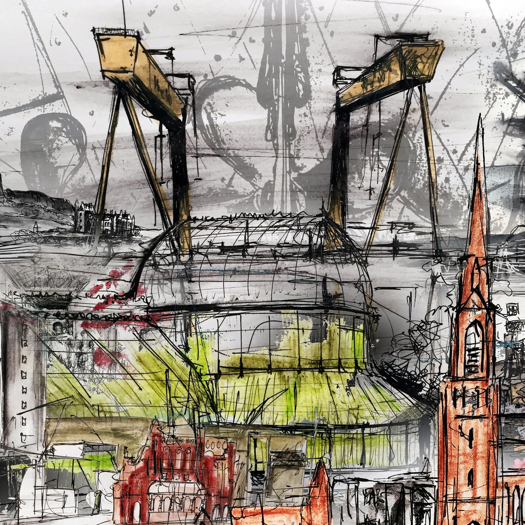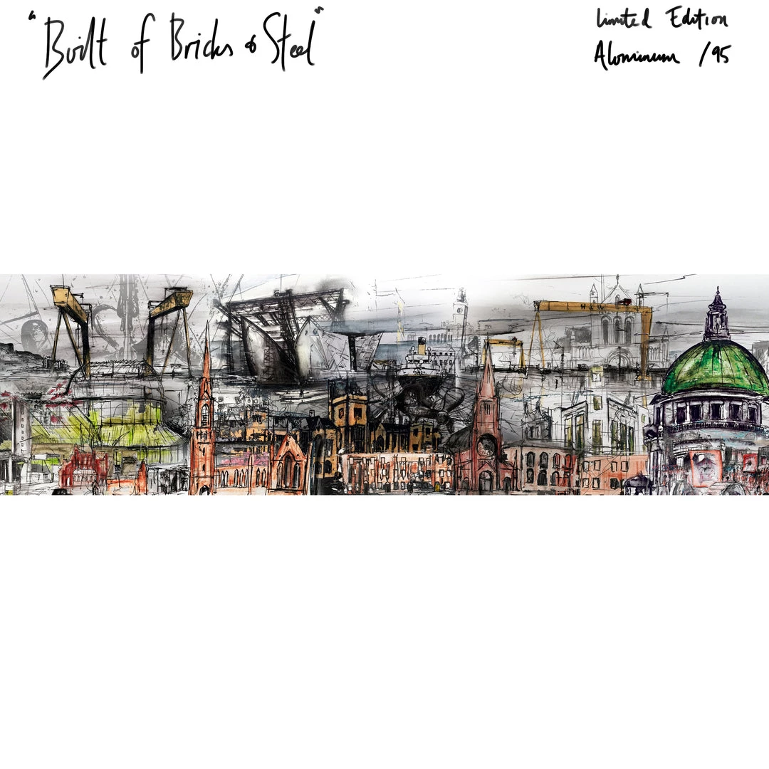 Built of Bricks n Steel is a moody and atmospheric piece that captures the essence of Belfast. These multi layered pieces weave a narrative through coastlines and ports, & iconic structures and figures. Limited Editions of /95 and are available on brushed Aluminium or Paper, these large pieces will light up and invigorate any space.