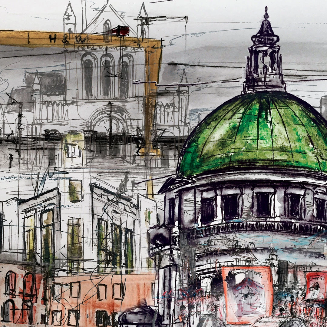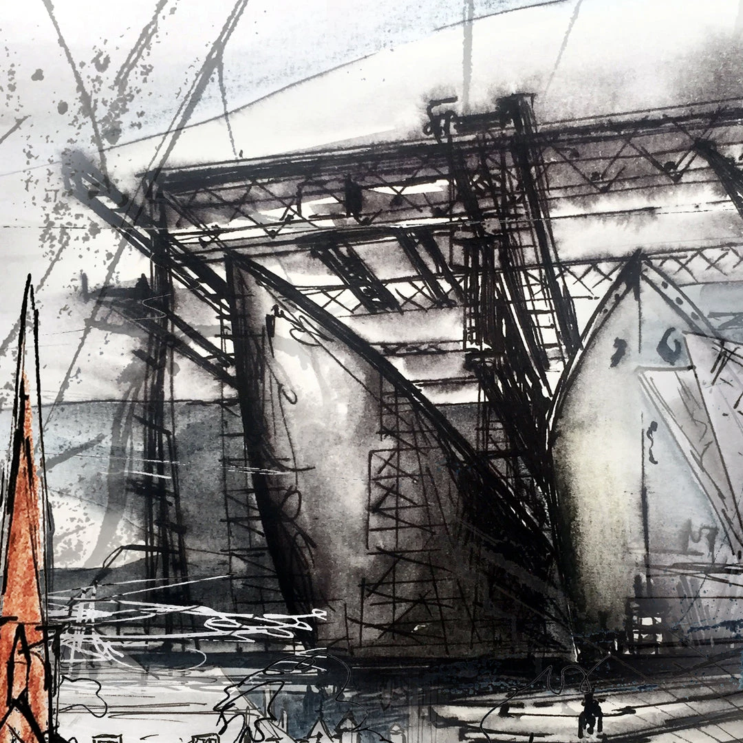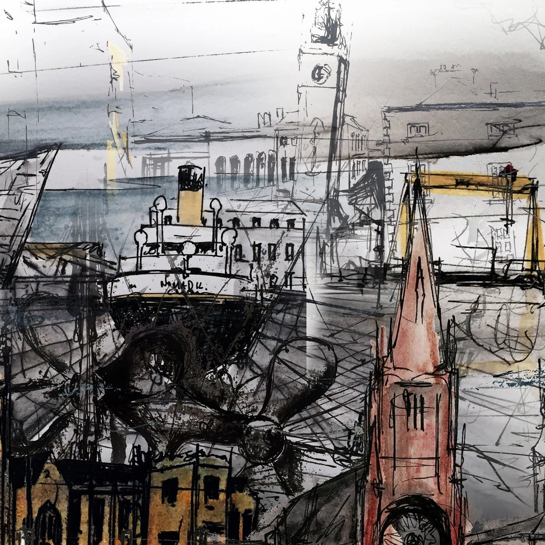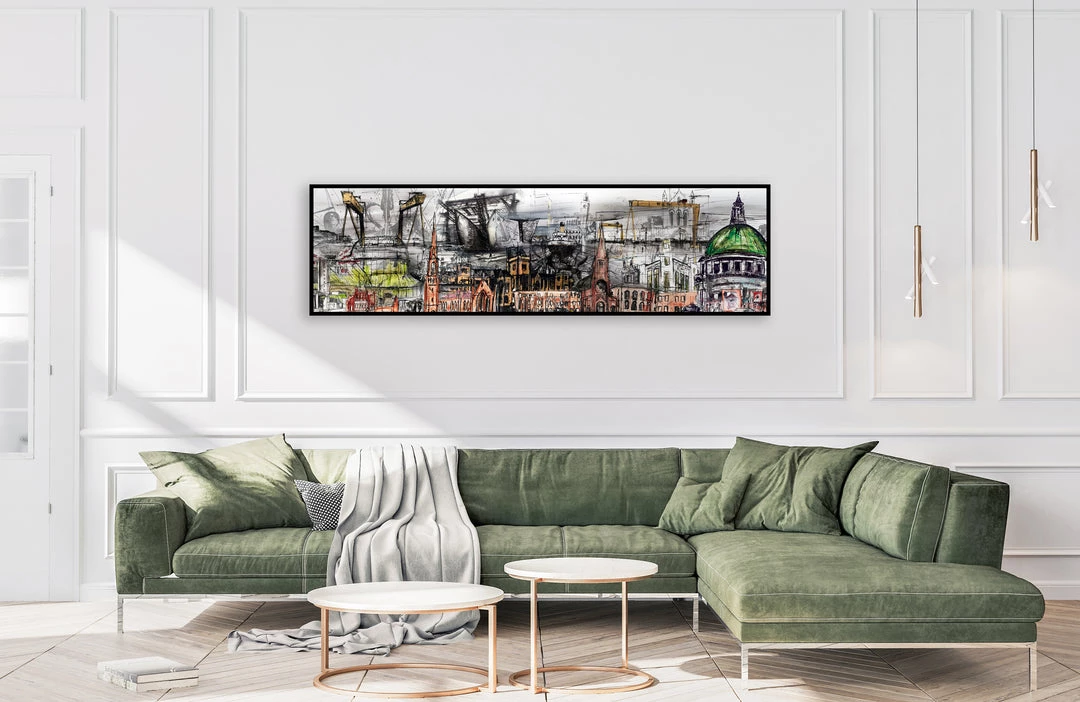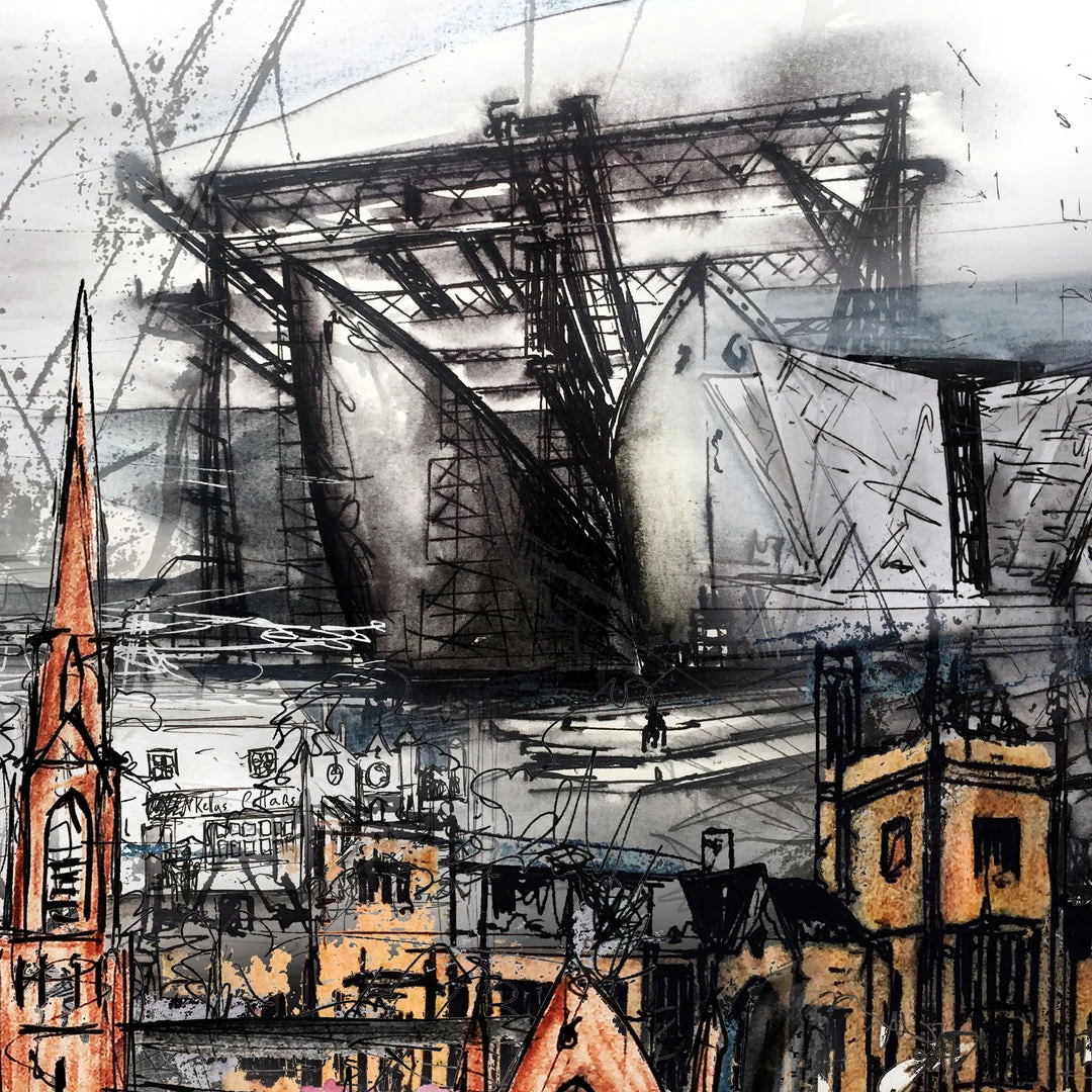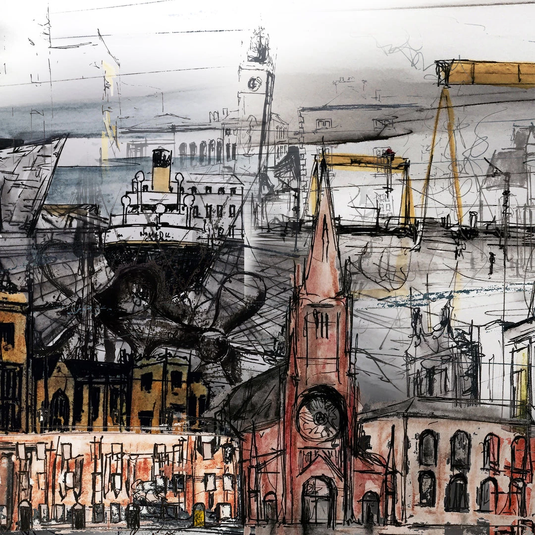 Built of Bricks n Steel is a moody and atmospheric piece that captures the essence of Belfast. These multi layered pieces weave a narrative through coastlines and ports, & iconic structures and figures. Limited Editions of /95 and are available on brushed Aluminium or Paper, these large pieces will light up and invigorate any space.