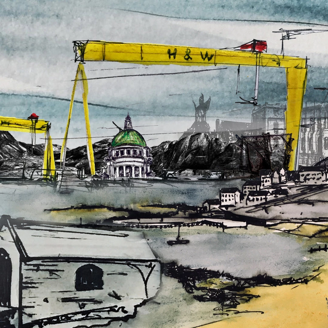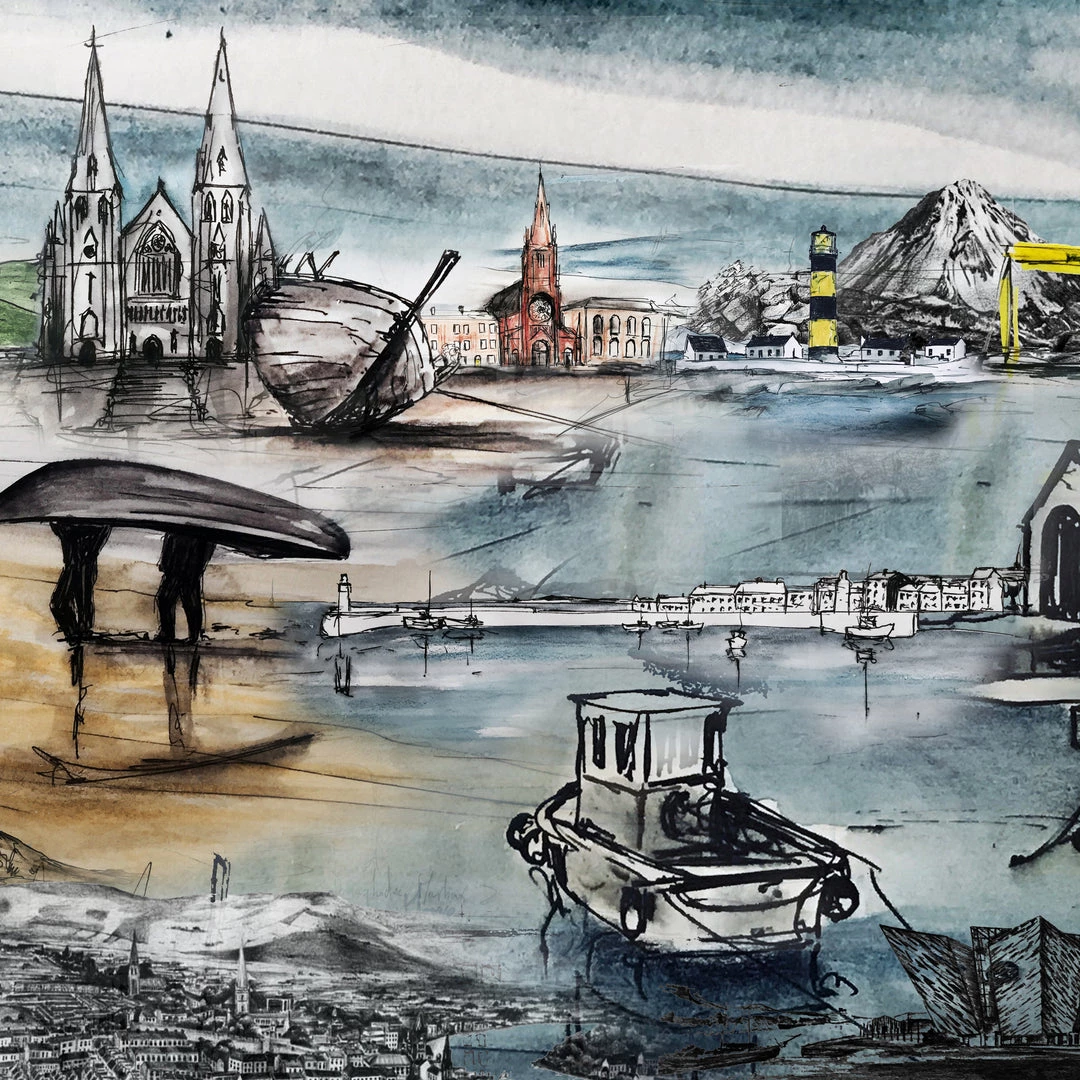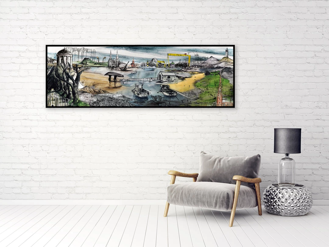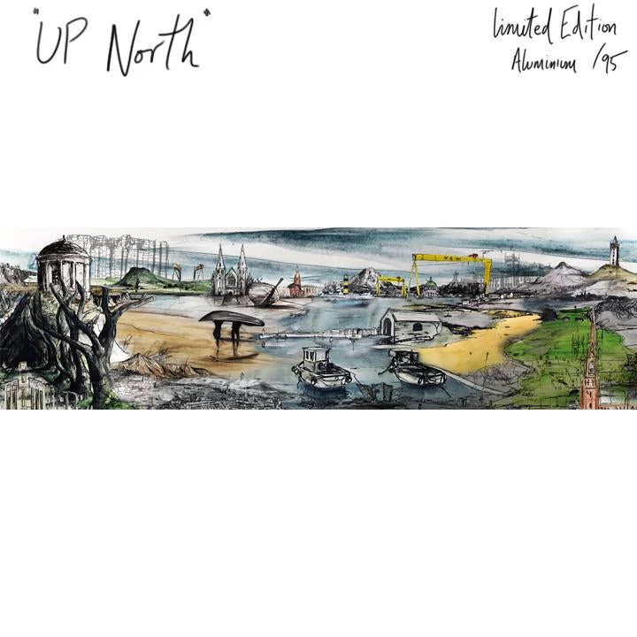 ‘Up North’ is a moody and atmospheric piece that captures the essence of the North of Ireland. These multi layered pieces weave a narrative through coastlines and ports, & iconic structures and figures. Limited Editions of /95 and are available on brushed Aluminium or Paper, these large pieces will light up and invigorate any space.