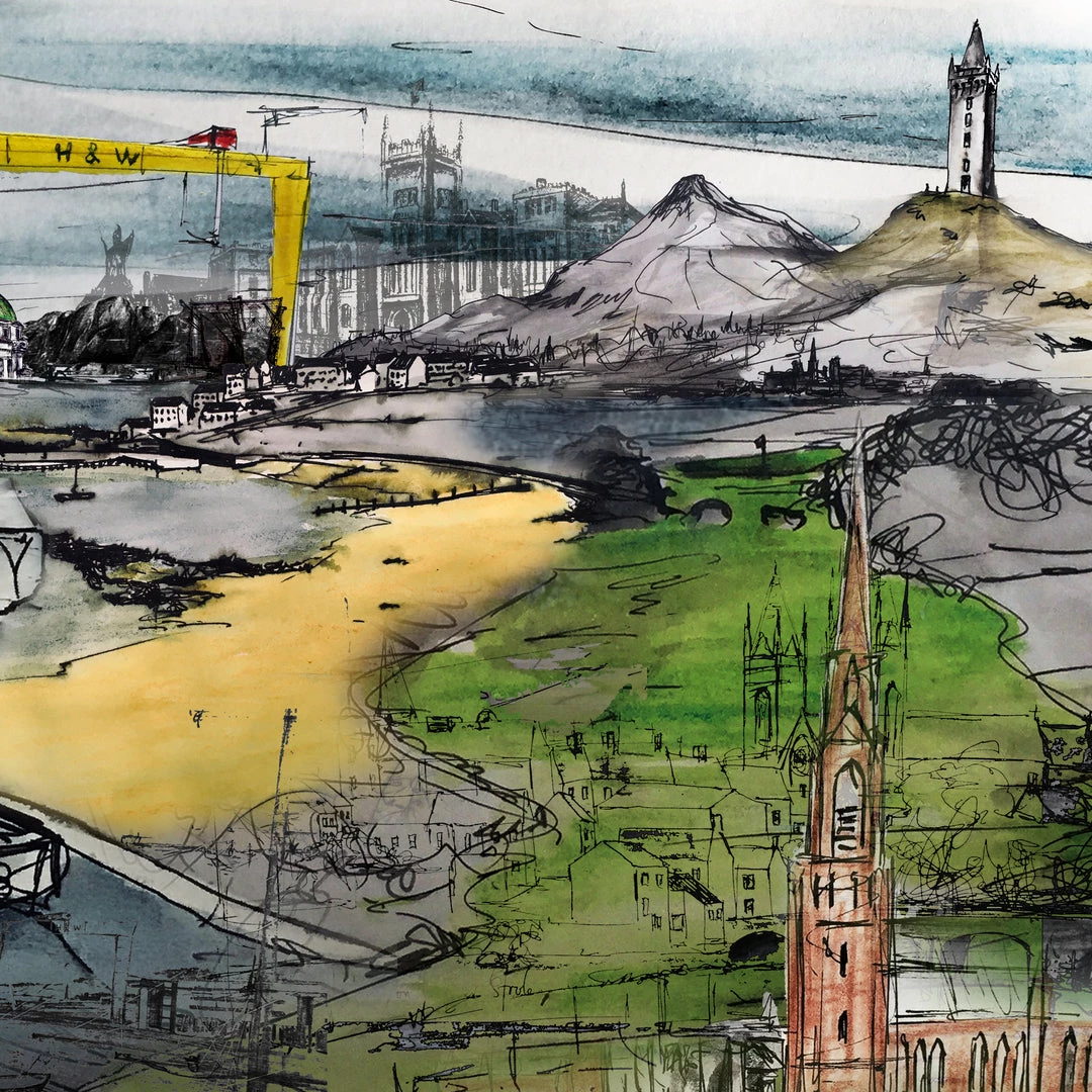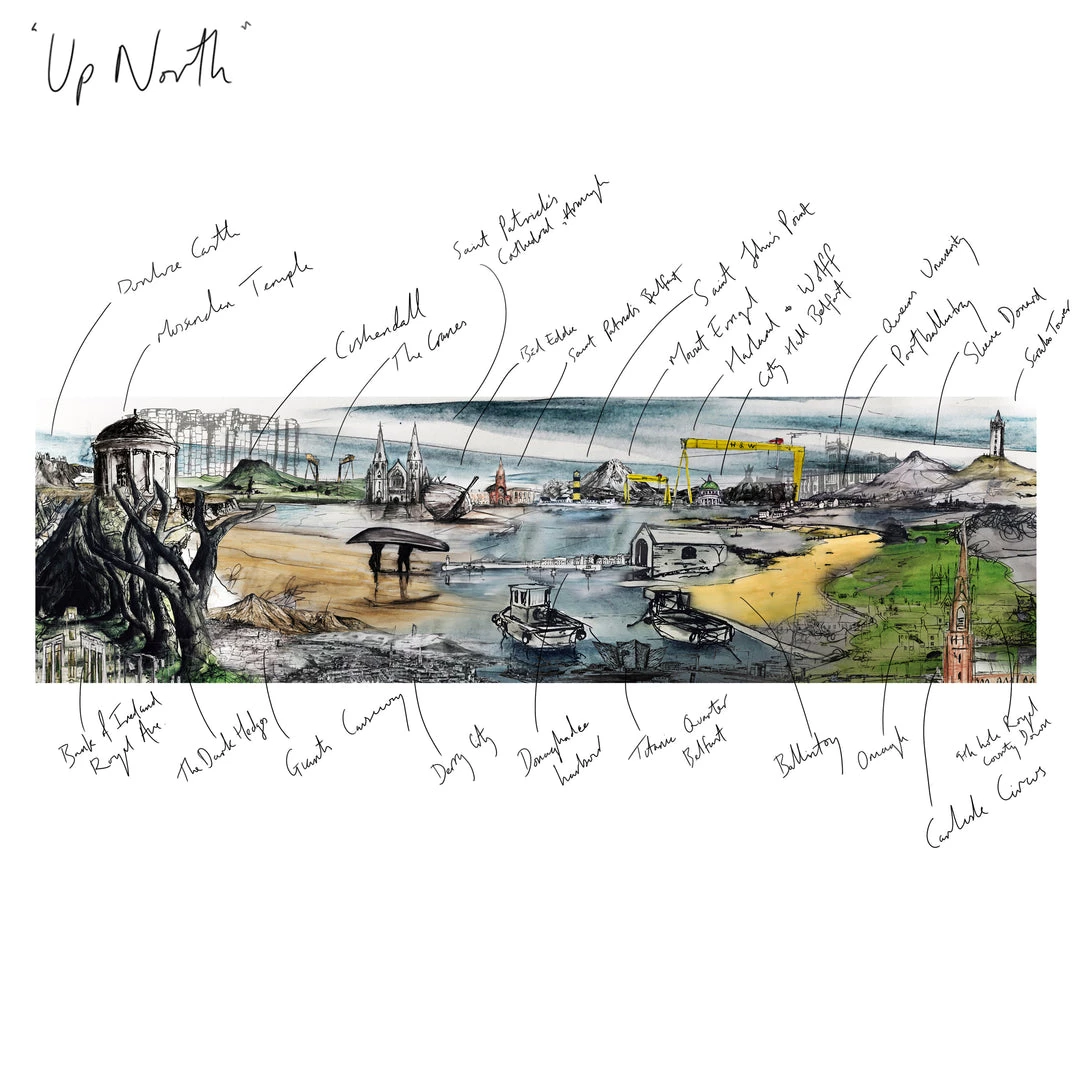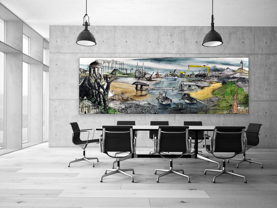 ‘Up North’ is a moody and atmospheric piece that captures the essence of the North of Ireland. These multi layered pieces weave a narrative through coastlines and ports, & iconic structures and figures. Limited Editions of /95 and are available on brushed Aluminium or Paper, these large pieces will light up and invigorate any space.